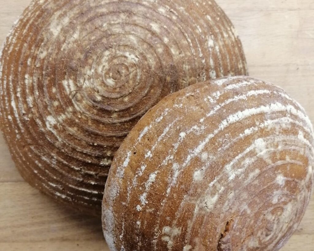 Bei 230 °C, mit Dampf, in dem Ofen schieben. Nach 5 bis 10 Minuten die Temperatur auf 210 °C reduzieren. Ca. 45 Minuten backen.